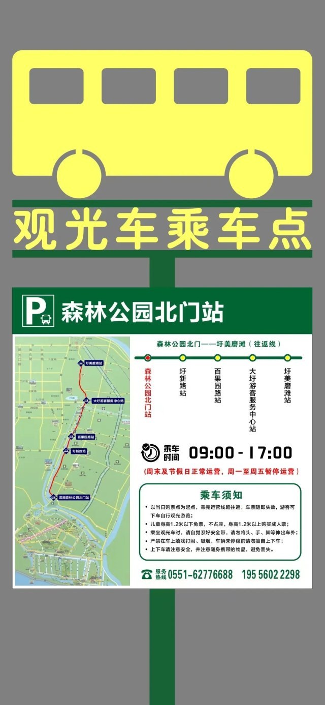 据了解,该观光车线路共设立5个站点,分别为森林公园北门站、圩新路站、百果园路站、大圩游客服务中心站、圩美磨滩站。