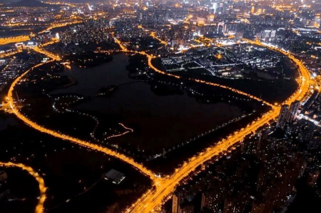 翡翠湖心形道路夜景。