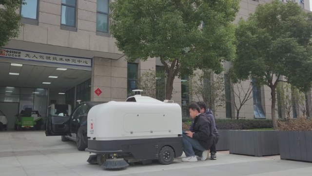 △在高新区,合肥中科智驰科技有限公司的技术人员正对一款无人驾驶清扫车做技术调试。
