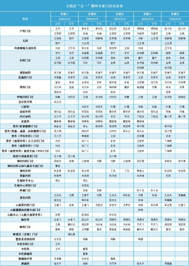 四、五一期间专家门诊可查看下表